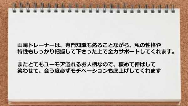 トレーナーは専門知識も然ることながら、私の性格や特性もしっかり把握した上でサポートしてくれ、 モチベーションも底上げしてくれました。